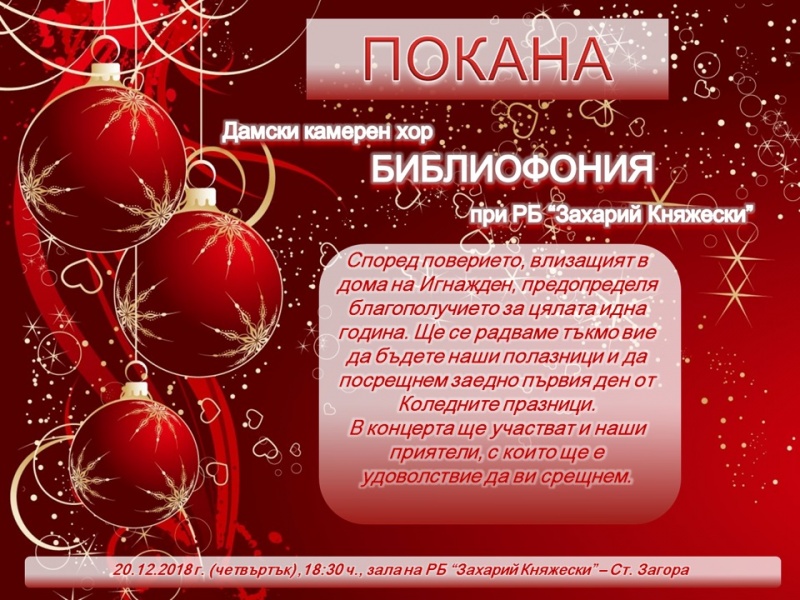 Покана за Коледен концерт на Дамски камерен хор "Библиофония" при РБ "Захарий Княжески" - Стара Загора